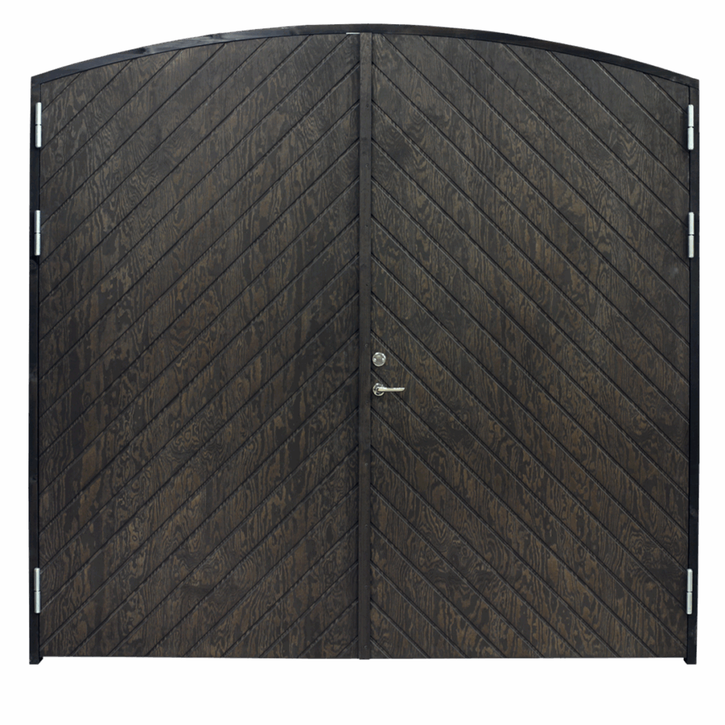 | Beslag | Minst 3 kraftiga gångjärn/dörrblad. Cylinderlåskista typ 565 inkl trycke (handtag) och täckskylt. Sidodörren på pardörrar är försedd med garageregel. Tillval: Kantreglar med hävarm. Stora pardörrar har garageregel invändigt på båda dörrbladen. Tillval: Fix 280 regel med handtag utvändigt och invändigt på gångdörren, kan kompletteras med standardcylinder. |